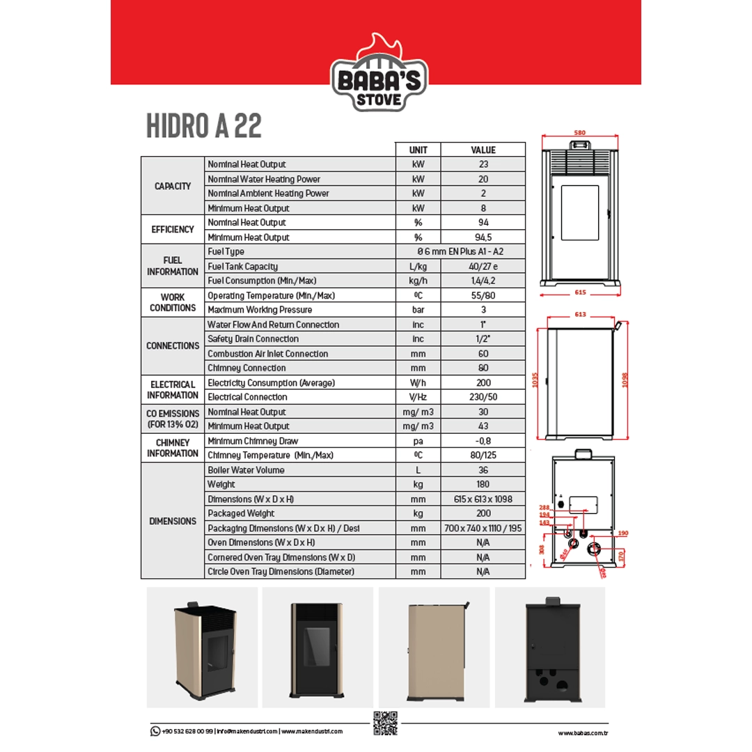 Hidro A 22; pelet ile çalışan otomatik sulu sistem pelet sobasıdır. · İç mekâna kurulmak için tasarlanmıştır. Alevi görebileceğiniz geniş bir cam kapağa sahiptir. ·
